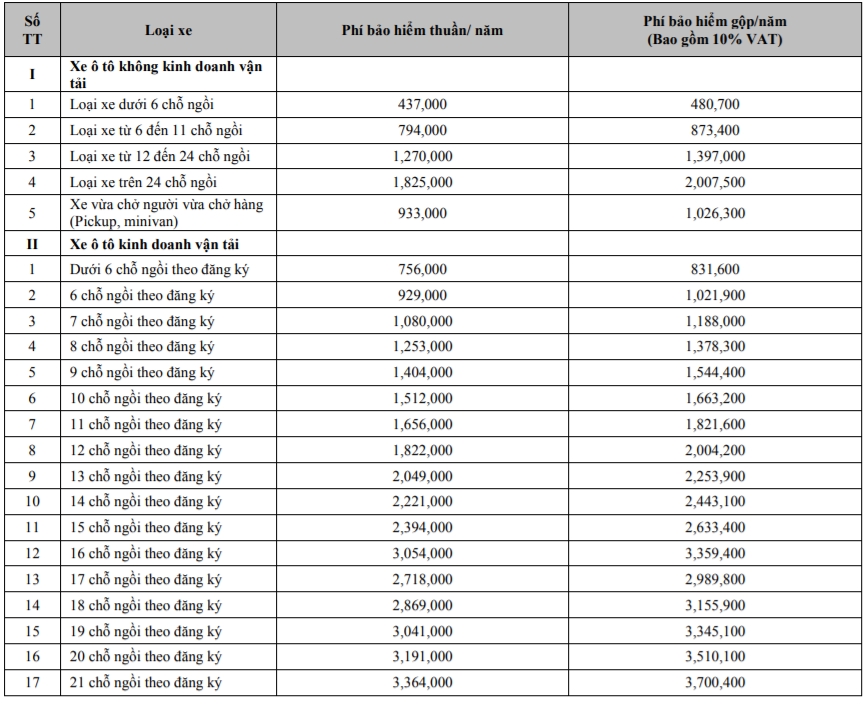 Sau đây sẽ là biểu phí bảo hiểm trách nhiệm dân sự xe ô tô bảo việt
